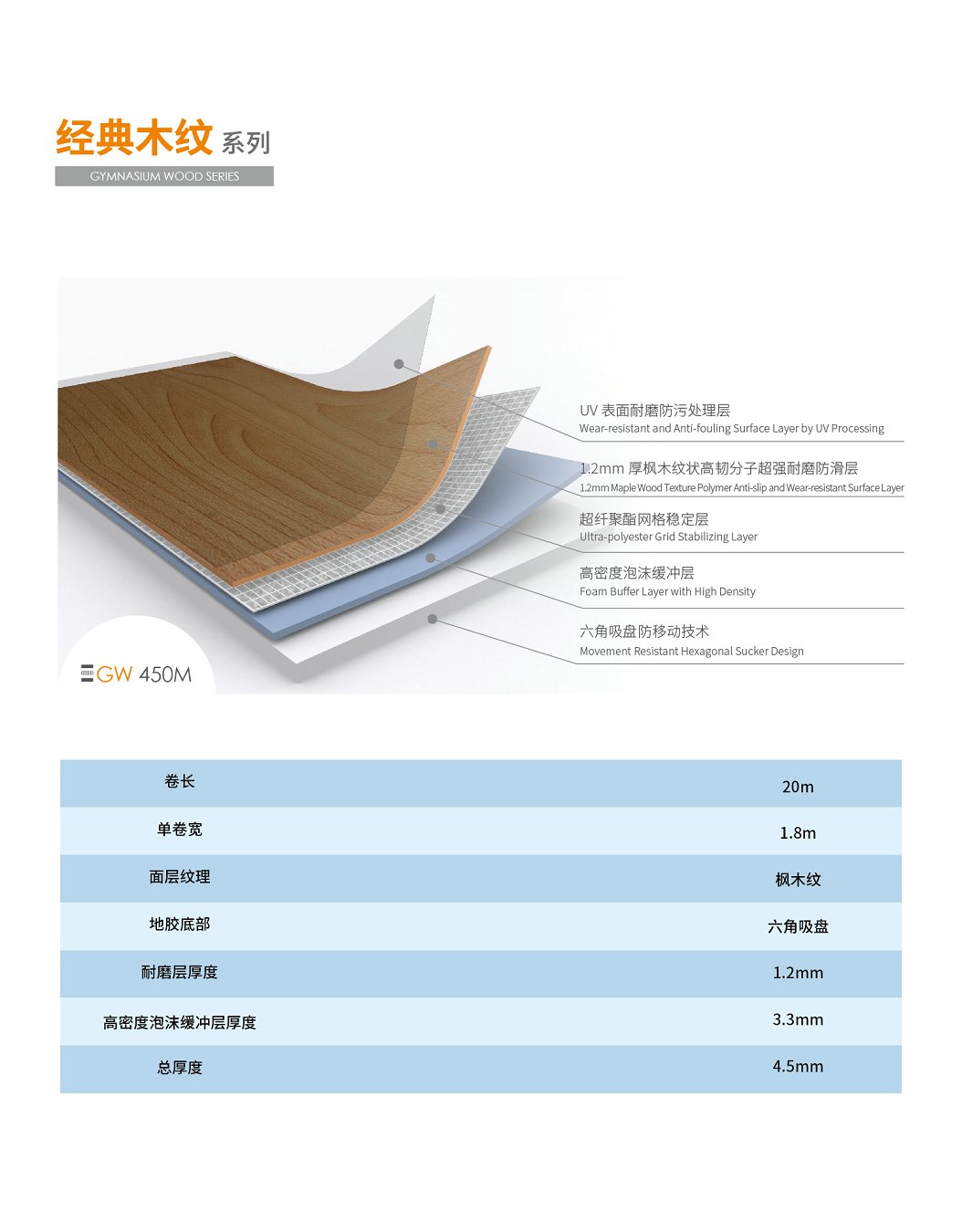 天速綜合地膠籃球場地膠經典木紋系列GW 450M楓木紋